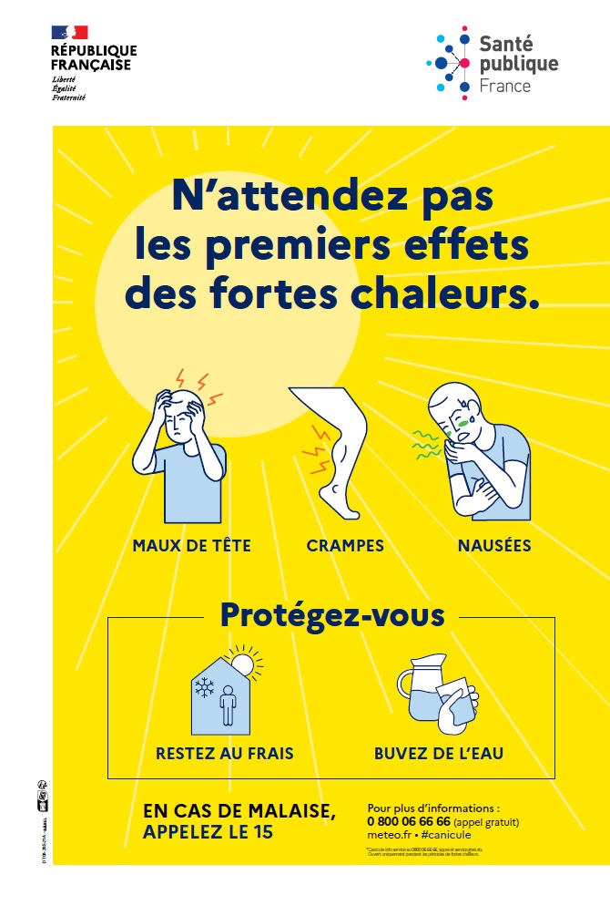Dans cette perspective, vous trouverez en lien, les affiches de recommandations qui rappellent les effets possibles des vagues de fortes chaleurs et les gestes de prévention pour s’en prémunir.