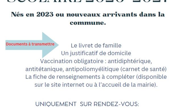A partir du 1er février 2026, il vous sera possible de venir inscrire vos enfants pour la prochaine rentrée des classes de septembre 2026.