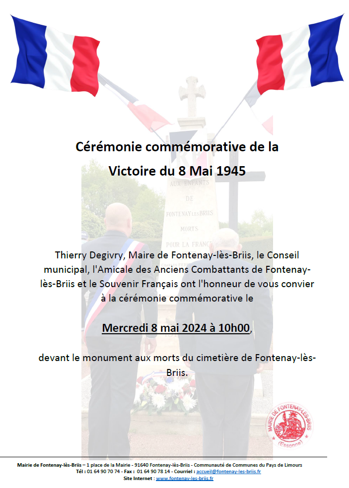 Les Élus du Conseil Municipal, l’Amicale des Anciens Combattants de Fontenay-lès-Briis et le Souvenir Français ont l’honneur de vous convier à la cérémonie commémorative de la victoire du 8 mai 1945 le mercredi 8 mai 2024 à 10h00 devant le monument aux morts du cimetière de Fontenay-lès-Briis.