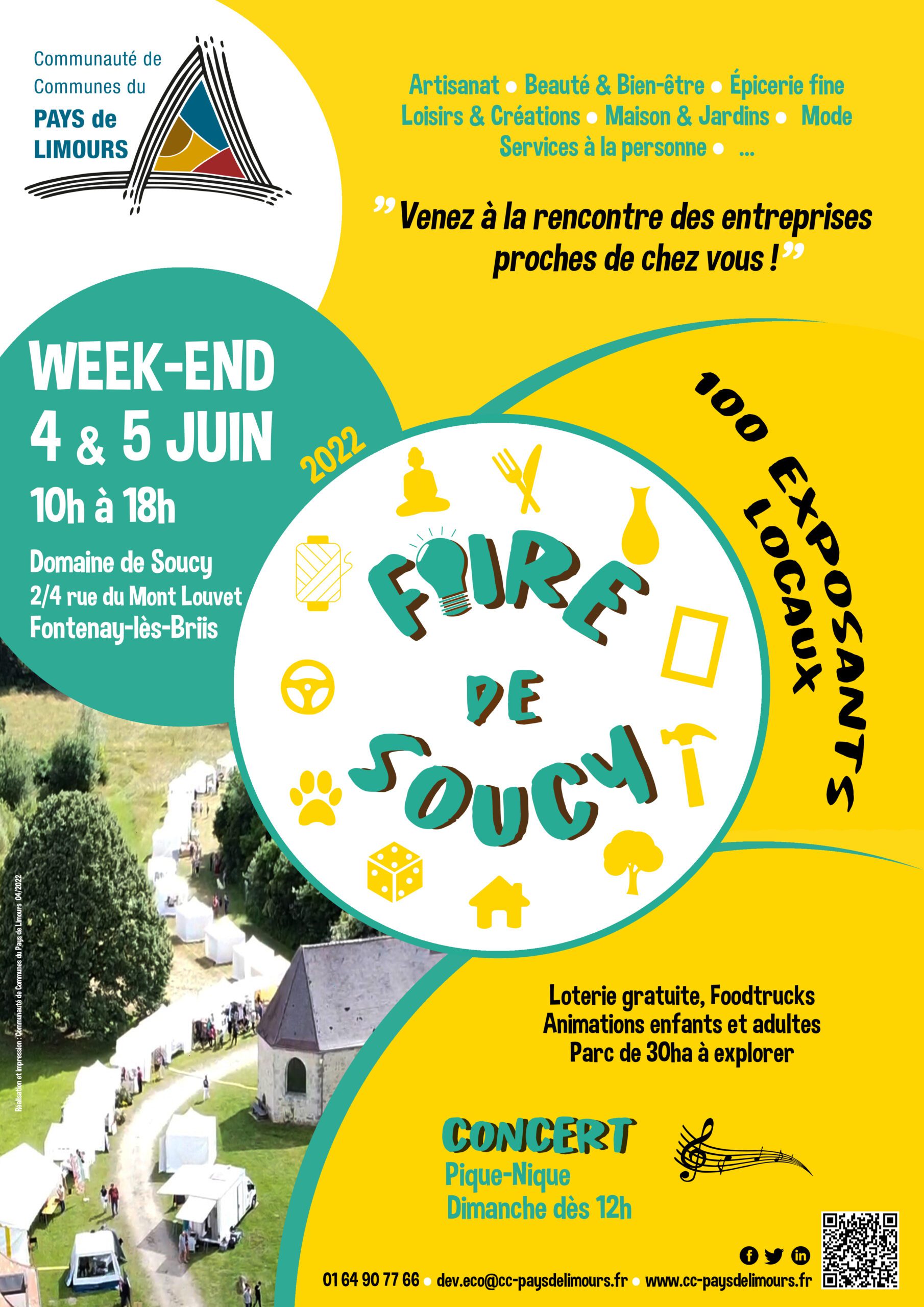 La Communauté de Communes du Pays de Limours (CCPL) organise pour la 2ème année consécutive la “Foire de Soucy” au Domaine de Soucy, 2/4 rue du Mont Louvet à Fontenay-lès-Briis, les samedi 4 et dimanche 5 juin 2022 de 10h à 18h.