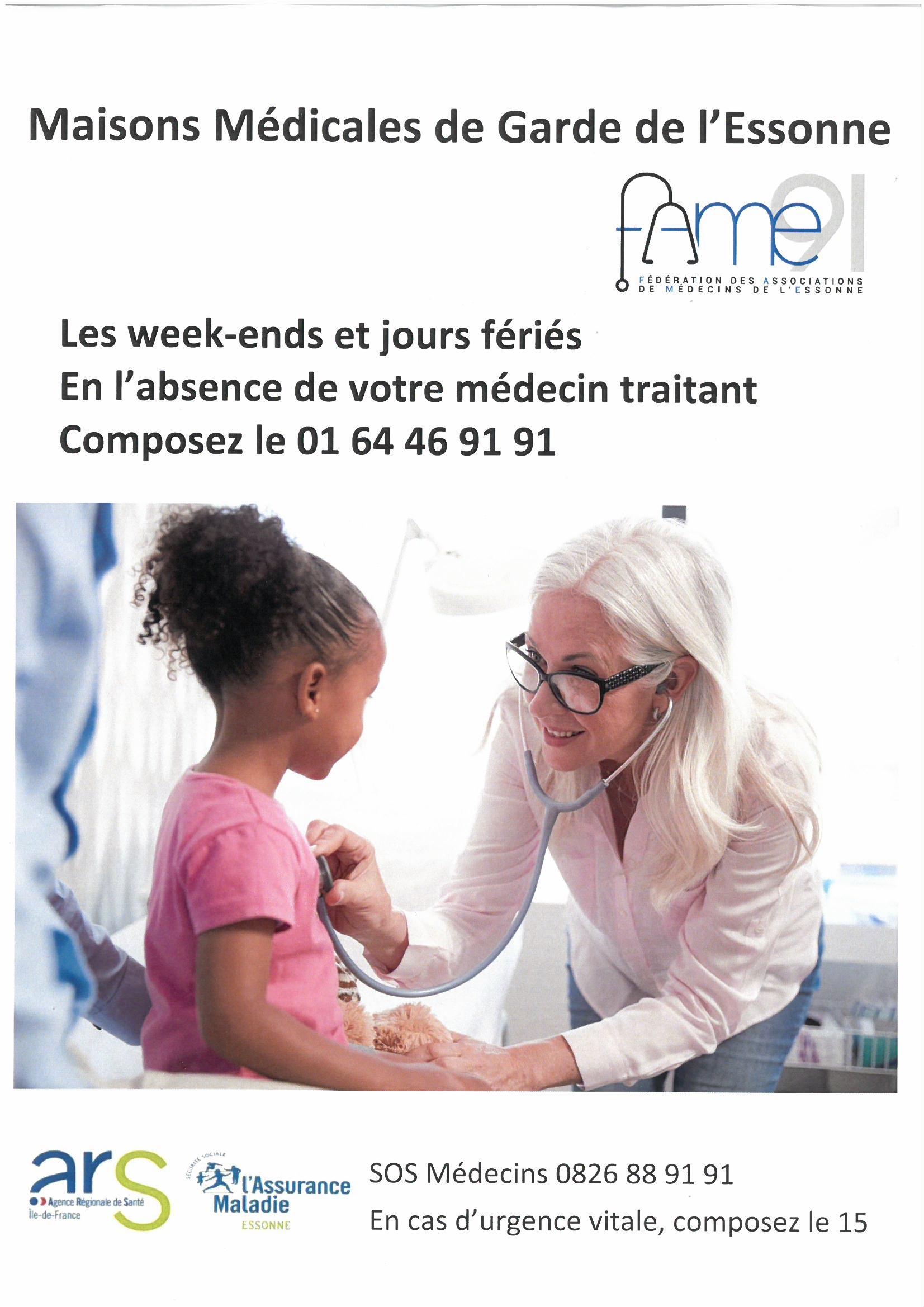 Médecins de garde La nuit et le week-end, contactez le répondeur de votre médecin traitant ou le numéro unique de la Maison Médicale secteur Ouest-Essonne au 01.64.46.91.91.